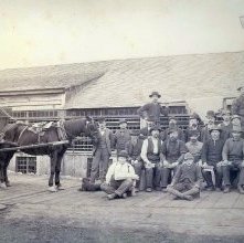 On back of photo, Bowman Tannery at Stony Creek, taken 80-90 years ago, seated 5th from right Mr. Clifford Denno, father of Mrs. Wemmett, contributed by Mrs. Ernest Wemmett, 2 Knight St., Glens Falls. Workers (with two workers holding pole that has tanned hides hanging from it). Wagon, horse, dog. Tannery is named for John Porter Bowman.
