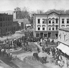 Firemen's Tournament, Glens Falls, Fountain Square. circa 1890. Hose cart & fire hose in play lower left. From Stoddard Vol lV. (Duplicates: 1977.218.502-3; 1977.132.593; 1974.16.52; 1976.62.1; 1982.35.55; 1983.84.347)