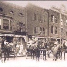 Red Line Fruit Co. owned by Martin J. Callahan. (horse, wagon, store, people; Union Square Tobacco; Dolan Building; automobile, car; commercial building) Mounted photograph.