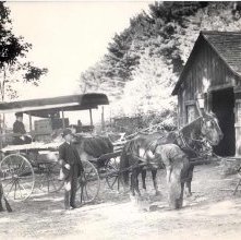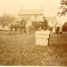 Mr. O'Brien, Henry, Laura and Kathleen, shows bee hives, two horses are seen in the foreground. Mounted black and white photograph.
